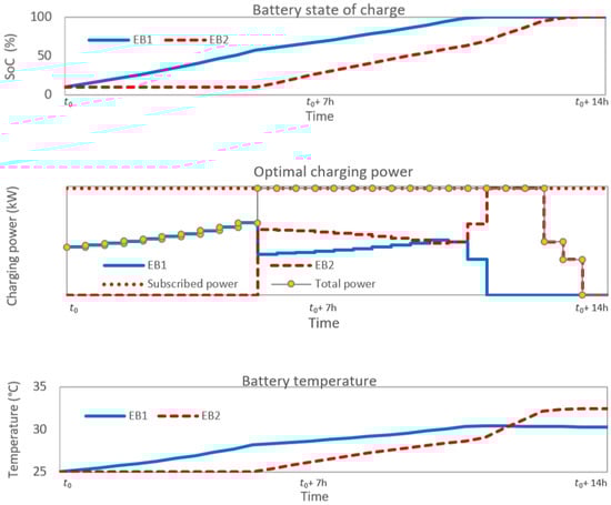 In scenario No. 2, we performed a charging optimization for a fleet of two buses by adding some real operating constraints to see if the optimization algorithm will converge while respecting all the operating constraints. The first EB arrives at with an initial SoC of 10% and must be fully charged at + 11 h. The second EB arrives with an initial SoC of 10% at + 5 h and must be fully charged at + 14 h. The results of this mono-objective optimization for minimizing battery aging cost are presented in Figure 8 and show that the optimal charging strategy is to power the two EBs EB1 and EB2 during all the possible charging periods (when each bus is available). The algorithm ensures that the EBs charging is done progressively without exceeding the subscribed power. At + 5 h, the algorithm will manage the EB2 arrival by decreasing the charging power of EB1. As a result of several constraints, the algorithm was forced to decreasingly charge EB2, otherwise the power would exceed the subscribed power.