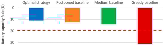 The greedy baseline strategy causes a significant capacity loss around 31%. Based on our simulation, if the bus operator uses the greedy baseline strategy, he has to replace his battery pack once during the 10 years of operation. Otherwise, if he uses the optimal strategy, he can save his battery pack during almost 20 years of operation generating a battery replacement cost saving of 155 k€ if we suppose that the battery pack costs 500 €·kWh−1. It must be noted that the optimization results are highly dependent on the battery electro-thermal aging model.