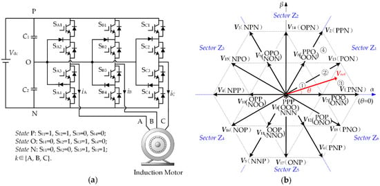 The topology of the NPC three-level inverter is shown in Figure 1a. Each of three phases (A, B, and C) has three switching states (P, O, and N), so there are 33 = 27 switching state combinations for the three-level inverter. According to Park transformation in Equation (1), each combination can be represented by a basic space voltage vector Vj, j = 0, 1, 2, …, 18, as shown in Figure 1b.
