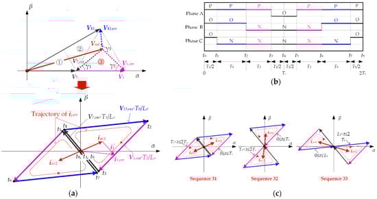 The trajectories of current ripple vector during (0, 2Ts] corresponding to Sequence 31, 32, and 33 are shown in Figure 3c. As can be seen, for different switching sequences, the relative positions of the mass center and the origin are different from each other, which means magnitudes of the average current ripple vectors are different. While shapes of current ripple triangles are the same. So the second item in the right side of Equation (8) is not changed. Then the following conclusion can be drawn: