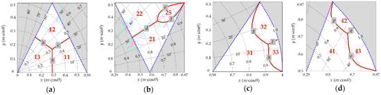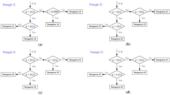 The optimal distribution of sub-regions for different switching sequences in Sector Z1: (a) Triangle ①; (b) Triangle ②; (c) Triangle ③; (d) Triangle ④.