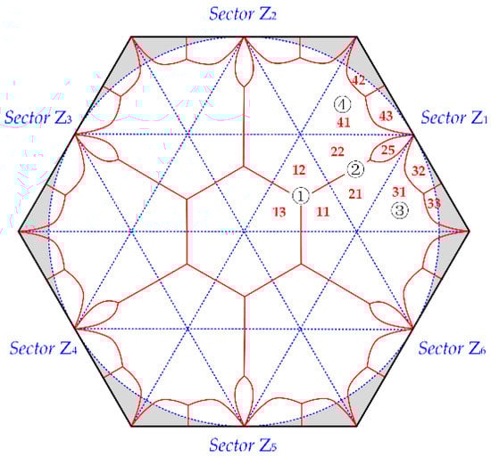 According to Figure 5a–d, the sub-region of each switching sequence in the whole space vector diagram is shown in Figure 6. The sub-regions are different because the types of switching sequences (continuous and discontinuous) adopted in each triangle are different.