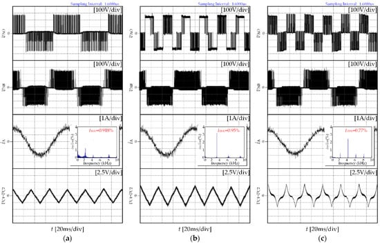 Experimental results for CPWM, DPWM3, and the proposed strategy when m = 0.2: (a) CPWM; (b) DPWM3; (c) the proposed strategy.