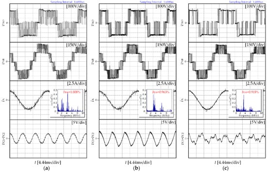 Experimental results for CPWM, DPWM3, and the proposed strategy when m = 0.9: (a) CPWM; (b) DPWM3; (c) the proposed strategy.