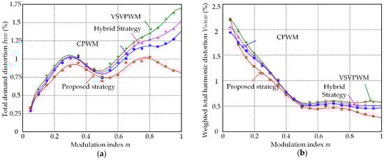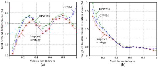 According to experimental results, the fast fourier transformation (FFT) analysis tool in Matlab is used to calculate the ITDD and VWTHD under different modulation index conditions. Then variations of ITDD and VWTHD with the change of modulation index m for CPWM, DPWM3, and the proposed strategy can be obtained, which is illustrated in Figure 11a,b.