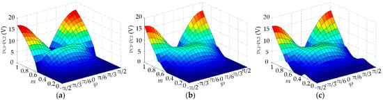 The dependence of neutral point voltage ripple vC1-vC2 on m and φ: (a) CPWM; (b) DPWM3; (c) proposed strategy.