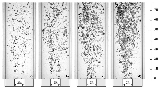 The photographs of bubbles in the sudden pipe expansion two-phase flow. ReH = 2.09 × 104, 2R1 = 15 mm, H = 13.5 mm, 2R2 = 42 mm, ER = (R2/R1)2 = 7.84. (a)—β = 0.6%, (b)—1.8, (c)—3.5; (d)—5.2.