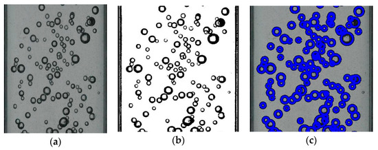 Measurements of the sizes of bubbles are performed using video with shadow illumination prior to the location of the expansion. To reduce the optical distortion, a box with a square cross-section, 10, is filled with immersion liquid. The video camera, 11, has a frame rate of up to 400 fps. Bubble sizes are calculated using an image-processing procedure in homemade code. The main steps of the algorithm are as follows: 1. The bubble area is chosen on the original image; 2. The image is binarized using an adaptive threshold; 3. Spherical or ellipsoidal particles are sought using a Hough transform. The image processing steps are shown in Figure 3. Figure 3a shows an original image of the bubble flow. The result of image binarization is shown in Figure 3b. The final image with the recognized images of bubbles indicated by blue lines is shown in Figure 3c. Not all of the bubbles are recognized, especially those from the clusters of bubbles, but all groups of bubbles were recognized and we obtain enough statistics for all sizes of bubbles.
