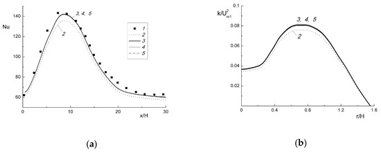 Grid independence tests for local heat transfer along the longitudinal coordinate (a) and radial profile of kinetic energy of turbulence at x/H = 5 (b). Points (1) are authors’ measured data, curves (2–5) are authors’ simulations results. ReH = 2.09 × 104, 2R1 = 15 mm, H = 13.5 mm, 2R2 = 42 mm, ER = (R2/R1)2 = 7.84, x/H = 5, qW = const = 8.95 kW/m2, T1 = Tb1 = 298 K, d = 1.7 mm. 2—128 × 50, 3—256 × 100, 4—450 × 200, 5—550 × 200 CVs.