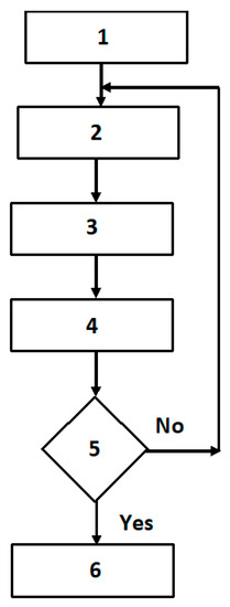 The solution methodology of the developed model. 1—Initial values input for all flow parameters, 2—Predictions of all flow parameters (two-fluid model + SMC), 3—Calculation of T and Tb, 4—Prediction of void fraction, 5—Convergence, 6—Stop.