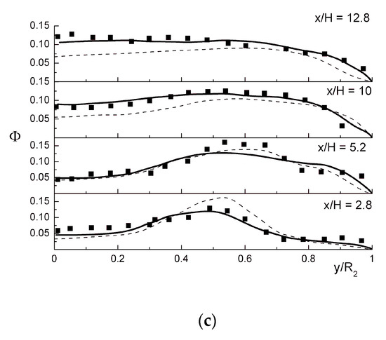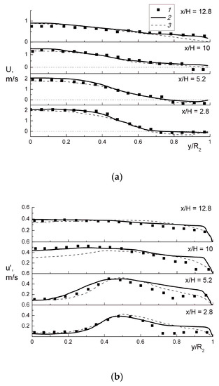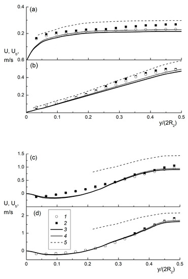The measured and predicted profiles for the mean velocities of the carrier fluid phase and gas bubbles are presented in Figure 6 at a few stations downstream of the pipe’s abrupt expansion. The first two sections are situated in the flow recirculation region and two other stations are set in the flow relaxation zone. Open symbols are the one-phase fluid flow and solid symbols are the carrier fluid in the bubbly flow. Solid lines are the predicted data for the fluid phase and dashed curves are the predicted results for the air bubbles. The liquid velocity for bubbly flows (2, 4) is higher than those for the one-phase fluid flow (1, 3). The predicted mean axial velocities for air bubbles (5) are higher than those ones for the liquid velocity in the presence of air bubbles due to the upward direction of the two-phase flow. Thus, it is seen that the axial velocities of the liquid in bubbly flow have negative values at first two sections (x/H = 4 and 8). The carrier fluid in the bubbly flow forms a zone with negative magnitude of mean axial velocity in the near-wall area. These conclusions agree with those for the one-phase separated flow [1,2,37].