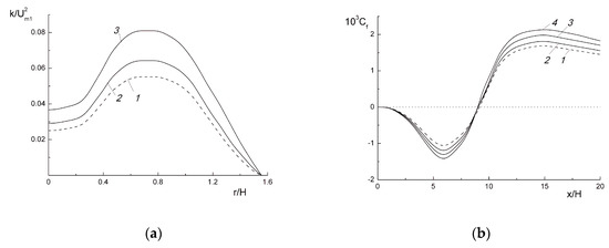 The profiles of TKE of the carrier fluid in radial direction at x/H = 5 (a) and wall friction coefficient (b). ReH = 2.09 × 104, 2R1 = 15 mm, H = 13.5 mm, 2R2 = 42 mm, d = 1.7 mm. 1—β = 0 (one-phase water flow), 2—3.5%, 3—5.2%.