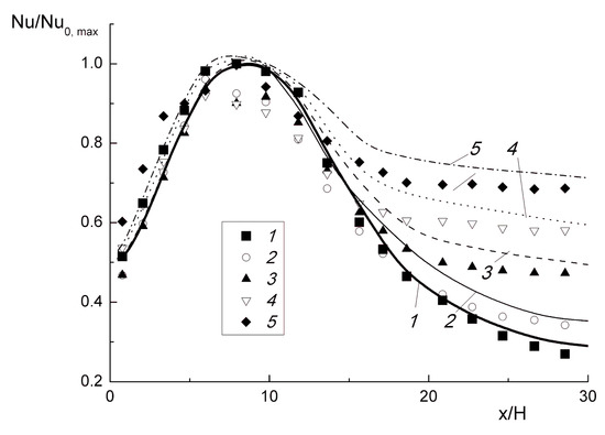 Figure 8 shows distributions of the parameter for heat transfer enhancement Nu/Nu0,max in bubbly flow in the pipe with sudden expansion with various β. The local Nusselt number is calculated using the Formula (14). Here Nu0,max is the maximal value of the Nusselt number for the one-phase flow. Points and lines are the results of measurements and numerical simulations performed by the authors, and the dashed lines represent the calculation for a one-phase flow (β = 0) under otherwise identical conditions. For visual clarity, only every seventh data point in the experimental data is shown in the figure.