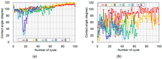 Change in contact angle with number of cycles in 100-cycle test with gap spacing 2 mm. (a) Just before commencement of voltage application. (b) Just after voltage interruption.