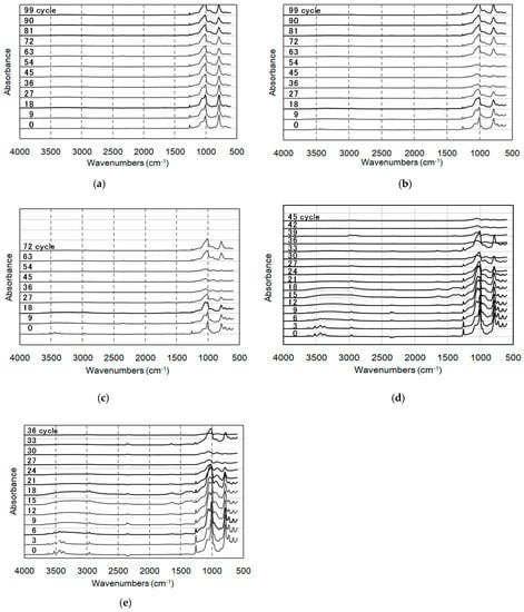 Change in FTIR spectra with the number of cycle obtained in the 100-cycle test with 2 mm air gap. (a) Sample A; (b) Sample B; (c) Sample C; (d) Sample D; (e) Sample E.