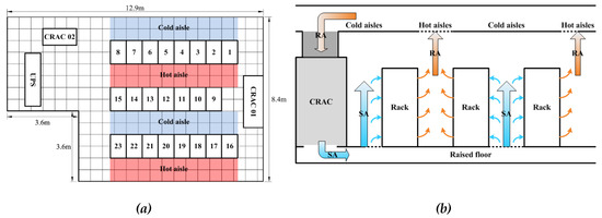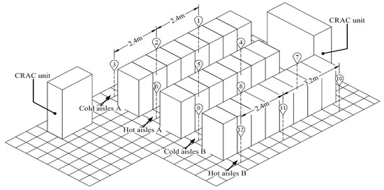 2 and height of 2.7 m is located in the computer science center of our university campus. There are 23 racks (each 1.2 m × 0.8 m × 2.0 m) within the data center with a typical hot aisle and cold aisle design arrangement. Two computer room air-conditioning (CRAC) units provide chilled airflow, which is distributed to the cold aisle for cooling down the heat generation from tracks through the raised floor. The schematic diagram of the investigated data center is shown in