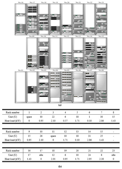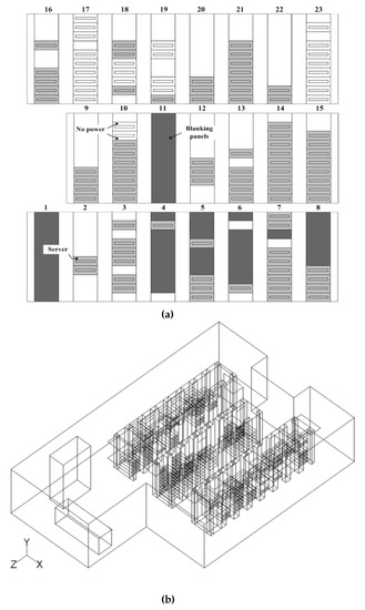 Figure 3a, which exactly corresponds to the on-site rack arrangement. A single server box with the dimensions of 0.75 m × 0.5 m × 2.0 m was assumed, which is equivalent to a 4 U (unit) server. One rack can accommodate a maximum of 10 server boxes. The lighter gray ones display servers that are idle, while the charcoal gray ones present servers under operation. There are still many uninstalled server spaces within the rack, which are presented in white, while some of them are blocked by blanking panels in black color. Moreover, the 3D geometric model for simulation of the investigated data center is displayed in