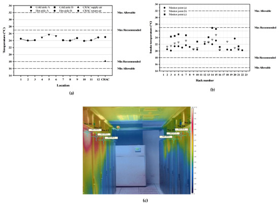 Figure 6b, the installation verification tests for the intake air temperature at each rack are presented. The temperature increased from the bottom to the top of the cold aisle at three sampling points (a, b, and c) for each rack. The sampling point c for rack 14 and rack 15 almost reached the maximum recommended limit of 27 °C even under partial load conditions, which reveals that the airflow management should be improved effectively to avoid high intake air temperature for racks.