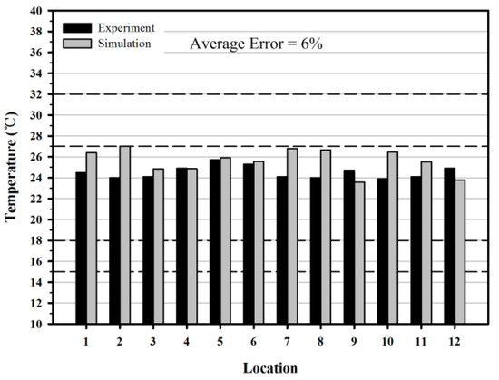Figure 8 depicts the comparison of CFD simulation and field test data at the same location. The simulation results present good agreement with the field test data except for a slightly lower temperature due to a simplified assumption ignoring minor heat generation from lighting and the power supply within the data center. The error percentage of 6% between simulation and field test data is acceptable for engineering applications.
