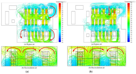 Figure 9a, the bypass airflow was obvious at both ends of the cold aisle, which corresponds to the field measurement scenario. Due to the lower supply air volume at the central part of the cold aisle, the recirculation airflow moving from the top of the racks also degraded the cooling performance. To improve the poor thermal performance of the airflow management, utilizing the enclosure on both sides of the hot aisle was conducted. The results from the CFD simulation depicted in