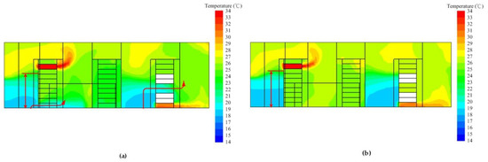 Figure 12c presents that the temperature increased 2–3 °C and the relative humidity decreased 5–10% after putting down the air curtain, which reveals that this approach not only enhanced the cooling performance but also reduced the relative humidity effectively.