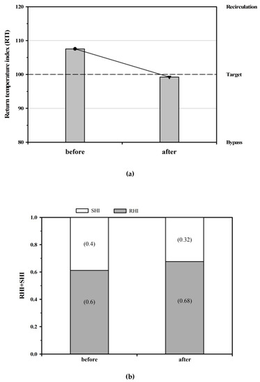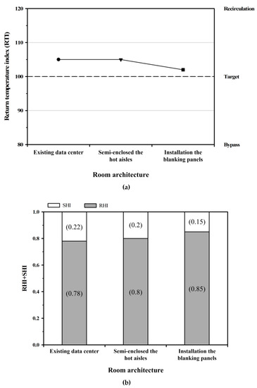 Figure 11a, the return temperature index (RTI) of the existing data center was 105%, which reveals that recirculation from both aisles was 5% deviated from the target (ideal) condition. The improvement approach via installation of blocking panels presented a better performance with an RTI of 102%, which demonstrates a 2% deviation from the target, which reduced the recirculation airflow from the hot aisle back to the cold aisle.