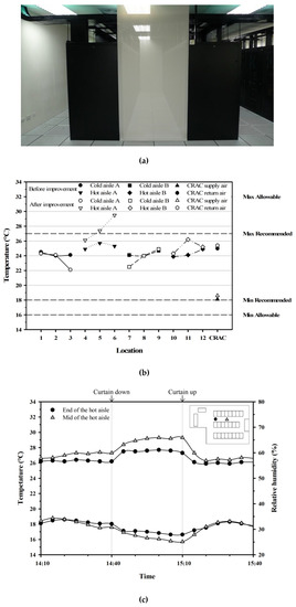 Figure 12a shows the snapshot of the physical air curtain enclosing the hot aisle. Field tests were conducted again to examine the thermal performance of the data center after utilizing the physical curtain. As presented in