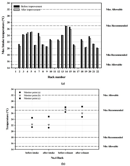 Figure 13b, the intake temperature did not decrease for rack 4 at sampling point c after using the physical curtain due to substantial bypass airflow through unoccupied rack spaces. This field measurement result also corresponds to the CFD simulation in