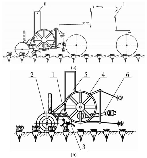 Front-mounted beet topper machine: (a) general view: I—carrying tractor; II beet topper machine; (b) constructive-technological scheme: 1—frame; 2—pneumatic feeler wheel; 3—rotary beet top cutting device; 4—loading mechanism of cutting beet top; 5—discharge chute; 6—drive working bodies.