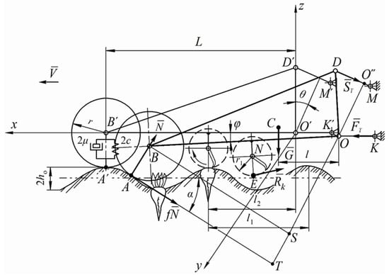 An equivalent scheme of movement only in the longitudinal-vertical plane of the front-mounted beet topper machine has been initially set up (Figure 2) []. In the equivalent scheme two different conditions have been considered: (i) the feeler wheel is reaching the top of soil irregularity; (ii) the feeler wheel is on the top of this irregularity.