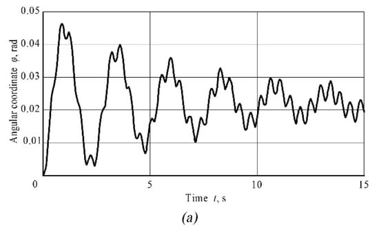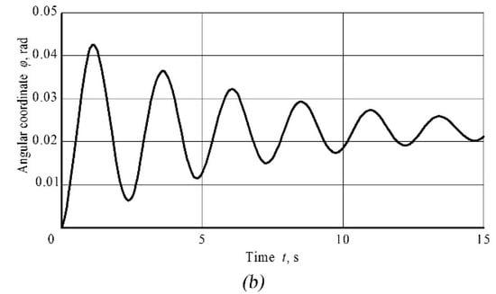 In particular in Figure 3a,b are reported, for two different tractor velocities (1.5 m s−1 and 3.0 m s−1, respectively), the angular oscillation trend of the front-mounted beet topper machine center of mass at the beginning of its movement in the case of a distance of between two consecutive soil irregularities (l1) equal to 0.7 m (Table 1). In both cases a damped behavior is shown with the main difference that at a low value of forward speed the corresponding trend curve has a jagged appearance as the feeler wheels have enough time to follow all the soil irregularities, while at higher forward speed the trend curve has a smoother shape as the feeler wheels have both not enough time to follow all the soil irregularities and these are crushed by the feeler wheels themselves. Furthermore, in both cases, the angular oscillation extends asymptotically to a common value equal to ϕ = 0.02 rad which, in turn, strictly depends upon the stiffness and damping coefficients of the feeler wheels 2C and 2μ, respectively (Table 1).