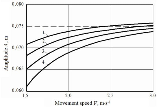 Relation between the amplitude of oscillations of the cutting device of the front-mounted beet topper machine A and the forward velocity V for different soil roughness step (1: 0.6 m; 2: 0.7 m; 3: 0.8 m; 4: 0.9 m).