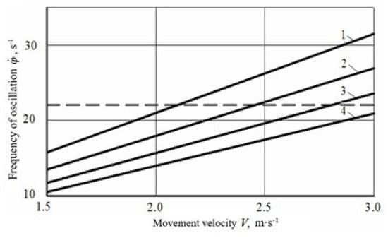 Relation between the frequency of oscillations of the cutting device of the front-mounted beet topper machine and the forward velocity V for different soil roughness step (1: 0.6 m; 2: 0.7 m; 3: 0.8 m; 4: 0.9 m).
