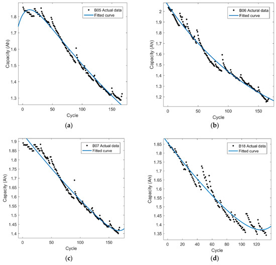 Optimized lithium-ion batteries play an important role in daily applications, from mobile phones, through microgrids, to satellites [1,2]. Despite the fact that they offer many advantages over other types of batteries, such as a low weight, high power density, and long lifespan [3], their performance degrades with repeated charging and discharging. Hence, their degradation identification, state estimation and prediction, and maintenance optimization have become a focus of attention in engineering research [4]. To optimize the energy deployment of a battery, avoid its premature failure, and improve its reliability and durability, it is important to monitor its degradation process accurately. This involves evaluating the state of health (SOH) [5] and predicting the state of charging (SOC) and remaining useful life (RUL) [6] in a battery management system (BMS) [7], which can be used for automated and optimized scheduling of maintenance actions that, in turn, ensure safe operation and use of lithium-ion batteries. Capacity is a direct indicator of SOH, where the end of life (EOL) is defined as the state in which the capacity reaches 70–80% of the nominal value [8] at the same SOC and operating conditions.