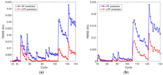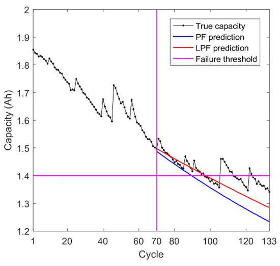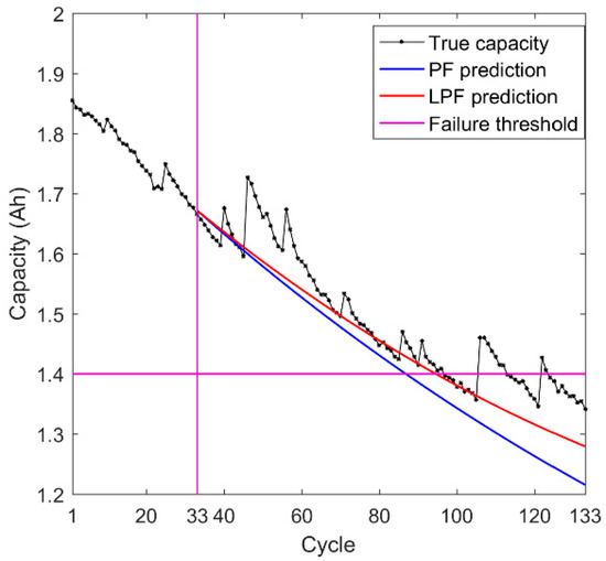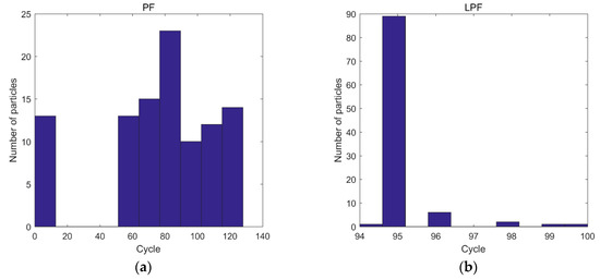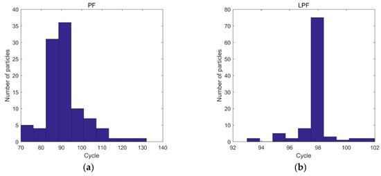 Moreover, according to histograms of the predicted RUL particle distribution using 33 and 70 observations, we draw the conclusion that more particles of the LPF when making a prediction were concentrated on the true RUL. In other words, the LPF well overcomes the lack of the particle collapsing problem, resulting in particle degeneracy and impoverishment. Further, better prediction results can be obtained using one-step ahead LPF prediction when the charge and discharge cycles proceed. This indicates that the proposed method has a good adaptability for lithium-ion battery degradation with non-linear and non-Gaussian characteristics.