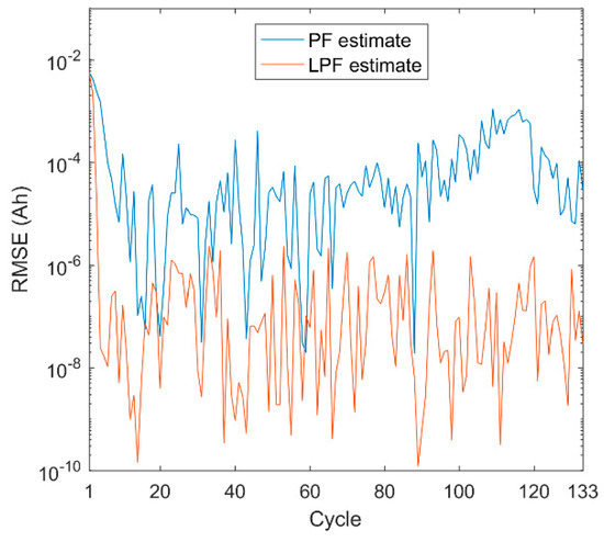 The accurate estimation of battery capacity not only depends on a degradation model, but also on its parameters. According to [30], using the LPF, the estimated capacity for each particle at cycle k is given by: