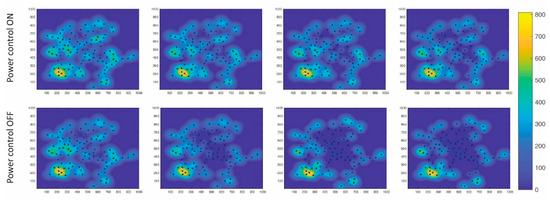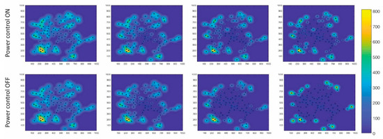 In the first simulation, a flat (non-clustered) network is considered where each node can communicate with the neighboring nodes within its transmission range. The result of this simulation is depicted in Figure 1, Figure 2, Figure 3 and Figure 4. Figure 1 depicts an example of a deployed network, with the heatmap highlighting the amount of available energy in the deployment field, where x and y axis defining the size of the field. The figure shows the case with power control ON and OFF. Each case is shown with four subgraphs that are obtained as time evolves in the simulation. As can be observed, the nodes in the center of the network that usually relay more traffic deplete their energy faster than those nodes in the outskirts of the network. However, using adaptive power control, it can be observed that energy is distributed more uniformly than the case without power control.