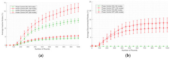 Figure 2 depicts the effect of power control on the percentage of inactive and disconnected nodes. Inactive nodes are defined as those nodes that ran out of power and are deactivated until they harvest enough energy to go back to sensing state. Meanwhile, disconnected nodes are defined as those nodes that have enough power to operate, however, they got disconnected from the rest of the network because of the broken links due to the inactive nodes. As can be observed from Figure 2a, when power control is ON, the network shows a slightly lower number of inactive nodes. The reason is that, by using power control, the nodes balance the energy consumption in a way that they try to reduce the traffic load on low power nodes indirectly forcing them to consume less energy. By increasing the number of nodes to 200, we can see more nodes that are running out of energy, where in round 1000, it reaches 9% and 13%, with and without power control, respectively. The reason behind this sharp increase in the number of inactive nodes can be due to longer hop routes from each source to destination, which causes more energy consumption. The effect of those inactive nodes on the network can be seen in Figure 2b, where the inactive nodes cause a part of the network to be disconnected from the rest. As it is shown earlier in Figure 1, nodes that are usually handling more traffic deplete their energy faster and run out of batteries. As those nodes are usually located in the central area and work as bridges between two sections of the network, their deaths cause network partitioning and disconnected nodes. However, as is shown, using adaptive power control, the network stays connected even in the presence of the same number of inactive nodes as nodes find new connections in the network since nodes can increase their transmission power. By increasing the number of nodes to 200, the network shows lower disconnected nodes due to more connections available that each node has. However, the pattern is still the same.