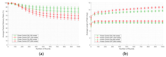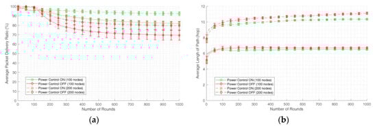 Network performance in terms of (a) average packet delivery ratio and (b) average length of path.