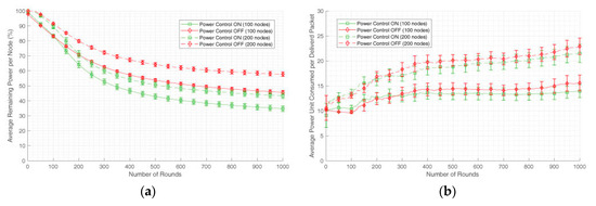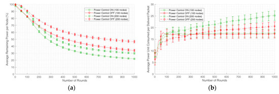 The network performance in terms of power consumption is shown in Figure 4. It can be observed from Figure 4a that using adaptive power control, the network consumes more energy (as it is expected) and the average remaining energy per node is less than that when not using power control. This is due to the increase in transmission power of some nodes to keep the network connected. It can be seen from Figure 4b that using adjustable transmission power, the network performs the same with and without power control when having 100 nodes, but when having 200 nodes, the network consumes more energy for each packet while using the power control. The reason is again the extra power used in the power control case to keep the network connected. However, considering that it achieves 20% extra PDR (see Figure 3a), it is a reasonable tradeoff.