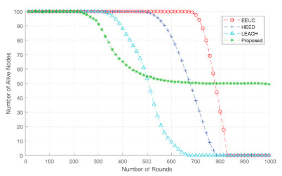 A comparison of the proposed protocol with three well-known protocols energy-efficient unequal clustering (EEUC), hybrid, energy-efficient, distributed clustering (HEED) [46], and low energy adaptive clustering hierarchy (LEACH) [47] has been performed in order to study the performance of the proposed protocol. The result of the comparison is depicted in Figure 9. As can be seen from the figure, the proposed protocol start losing some nodes around round 300, while other protocols start performing better. The reason behind is the sudden increase in the transmission power of some nodes in the proposed protocol. However, the rate of dying nodes starts to slow down by round 500. Other protocols maintain most of the nodes’ power, but they face a sudden decrease in the number of alive nodes, as by then, most of the nodes lost their high percentage of power. As can be seen, by round 700 to 800, most of the nodes are dead in the other protocol, while the proposed protocol shows better performance having around 50% of the nodes alive. The reason is that nodes are relaying lower traffic due to the loss of some connections.