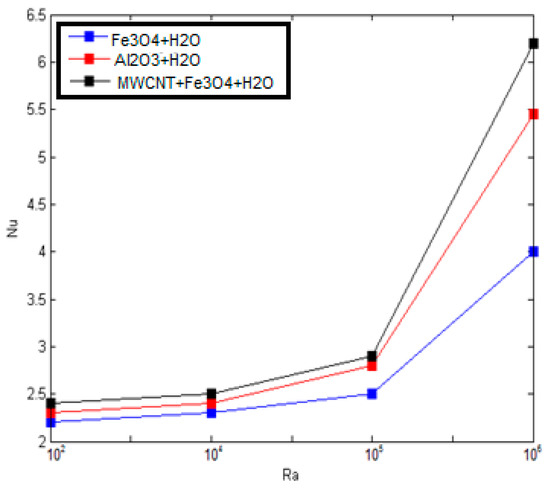 - According to the results obtained, the use of a hybrid nanofluid instead of a mono nanofluid increases the heat transfer coefficient so that the Nusselt number increases in both low and high Rayleigh values.