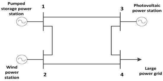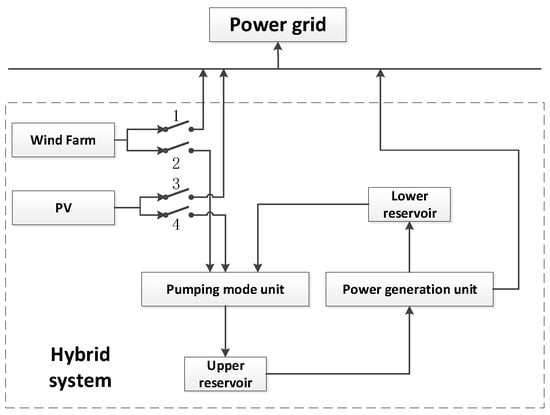 In order to reduce the amount of wind and solar abandonment, and improve the efficiency of wind and solar resources, this paper considers the hybrid wind–PV–pumped storage system as an equivalent generation unit for the large power grid, which provides a continuous and stable power supply to the customers. The topology of this hybrid wind–PV–pumped storage system is shown in Figure 1.