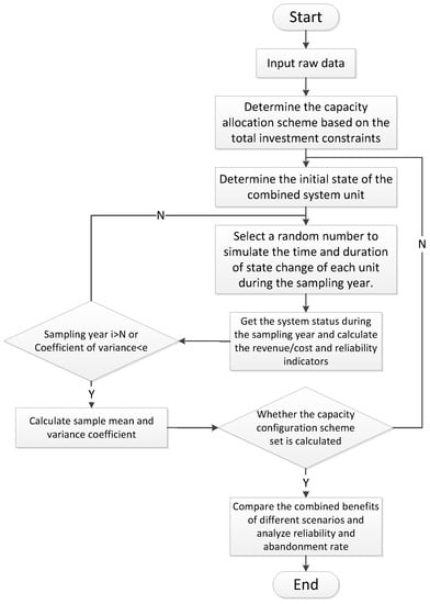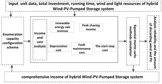 The flow diagram of the optimal capacity configuration method for the hybrid wind–PV–pumped storage system is constructed and presented as shown in Figure 2. The enumeration method and sequential Monte Carlo method are used to calculate the comprehensive benefits under different capacity configurations by taking into consideration the electricity on-grid profits, peak shaving ability, investment allocation, fault maintenance and generation unit start–stop. In this case, the calibration of the system reliability of new energy power stations is calculated. This specific model is introduced in detail in the following sections.
