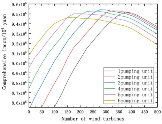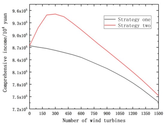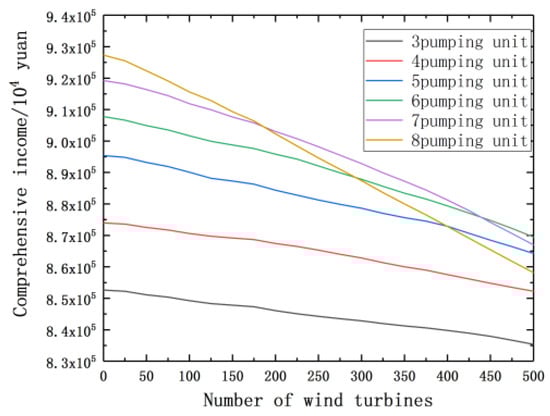 The ordinate indicates the comprehensive benefit of the hybrid system, and the abscissa indicates the number of wind turbines; accordingly, the number of PVs can be determined because of the fixed amount of investment. Therefore, the PV quantity is not introduced here. In Figure 7, strategy 1 is implemented, and it can be seen that when the system prefers to abandon PV, the comprehensive benefit decreases with the increase of the proportion of wind turbines. This shows that PVs have a better comprehensive benefit than wind farms under the same investment. As shown in Figure 8, according to strategy 2, the comprehensive benefit rises as the number of wind turbines increases before reaching the maximum value. At this time, the wind and light characteristics are the main influencing factors. The increase of wind turbines can significantly reduce the volatility of the photovoltaic output and reduce the disposal of new energy to achieve the goal of increasing revenue. When the number of wind turbines increases to a certain value, the overall revenue decreases as the number of wind turbines increases. At this time, the comprehensive benefit generated by the unit capacity cost is the main influencing factor, and the unit capacity cost of the wind turbine unit is lower than that of the photovoltaic unit. When the hybrid system is equipped with four pumped storage units, the comparison of strategy 1 and strategy 2 is shown clearly in Figure 9. With strategy 2, in order to guarantee the maximum comprehensive benefit, PV has the priority over the wind farm, whose redundant power is used for pumping in water and storage adjustment. Referring to the results of Figure 8, three optimal capacity allocation options with the maximum comprehensive benefit are illustrated in Table 2, when the number of pumped storage units are 3, 4, and 5.