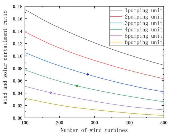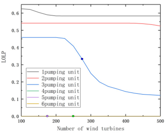 The comprehensive benefits of option 1, 2, and 3 are similar. The system reliability index as well as the wind and solar abandonment rate are calculated by the sequential Monte Carlo method, as shown in Figure 10, Figure 11 and Figure 12, and the comparison results are shown in Table 3. When the pumping storage unit is between 4–6 units, the hybrid wind–PV-pumped storage power system’s probability of load loss (LOLP) and the expectation of insufficient power (EENS) are zero, as shown in Figure 10 and Figure 11. According to the requirements of the 13th Five-Year Plan, there should be basically no wind and solar curtailment in the newly-built wind farms and PV power plants. Additionally, the wind and solar curtailment rate should be controlled within 5% in 2020. The corresponding power shortage probability (LOLP) of option 1 is 0.33. The annual electricity shortage value (EENS) is 1307 MWh, so the system reliability is low, and the wind and solar curtailment rate is 7.1%, which does not meet the requirement. In contrast, the power shortage probability and annual electricity shortage value in option 2 and 3 are basically 0, which meets the reliability requirement. Additionally, the wind and solar curtailment rate is less than 5%. The comprehensive benefit of option 2 is slightly higher than Scheme 3. Therefore, considering the system reliability and economy together, under the typical wind and solar data in this region, the optimized wind farm, PV and pumped storage capacity are 750 MW, 5532 MW and 320 MW, respectively.