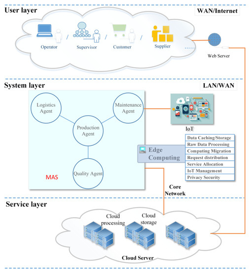 The user interaction layer generated by user abstraction comprehends service requests and preferences via human–computer interaction. As internal users, the supervisors and operators have access and permission to retrieve and invoke the underlying data with LAN (local area network) /WAN (wide area network); as external users, the customer and supplier can share their actual product, delivery, and quality information in a standard data format through cloud connectivity in XML. Since the communication and interaction are implemented on the centralized platform, the user interaction layer is virtually a cloud-based application layer.