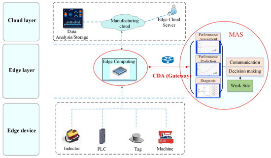 The edge-based system layer is deployed in relation to an IoT system and MAS architecture. Figure 2 illustrates the cooperation of the key components that are relevant to this layer. In the proposed framework, edge computing is granted permission to shrift the required computational power out of the cloud center, and locate it closely to end-user devices (e.g., test equipment). That is, edge devices acquire the equipment data and transfer it to the edge server (e.g., intelligent gateway) through network interconnection. An edge gateway facilitates the necessary performance of storage and computing resources, management of membership, and logic operation. On the other side, the allocation of edge computing is regulated by MAS. MAS proceeds reasoning and makes decisions that act on the end effectors (work site) based on information fusion. The edge server keeps delivering the aggregated data to the cloud platform for further analysis and storage.
