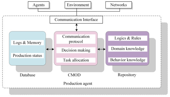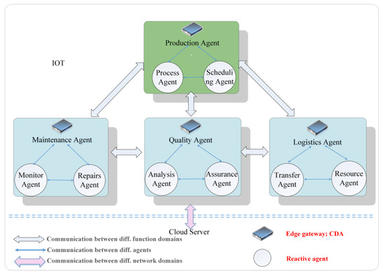 Figure 3 schematically demonstrates the system layer under the development of a MAS-based framework. The framework also specifies a domain-based hierarchical structure. The MAS is equipped with a set of intelligent agents (production agent, quality agent, logistics agent, and maintenance agent) that regulate their subagents in each respective domain. There are two hierarchies. In the first hierarchy, the quality agent, maintenance agent, and logistics agent collaborate with each other and are harmonized by the production agent for achieving a common production target. These four intelligent agents own the capabilities of data processing, aggregation, and storage, and can act as an edge server (intelligent gateway). With the features of intelligent gateways, the agents realize the protocol transformation between different types of perceptual networks and communication networks both in WAN and LAN. According to the categories in [35], and taking the functionality into account, they are designed as a kind of hybrid collaborative and deliberate agent (CDA) whose structure is presented in Figure 4 as an example. A CDA consists of database module, repository module, control module, and communication interface module. It can be abstracted using a four-tuple: