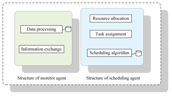 The CDAs in the first hierarchy manage and dominate the performances of their subagents (e.g., monitor agent, resource agent, and scheduling agent in Figure 3) that stay on the second hierarchy of the multi-agent architecture. These subagents collaborate with each other to support the decision makers (CDAs) in their own functional domains. According to the work specification, they are designed as a type of reactive agent. From Figure 3, it can be seen that in each specific domain, one CDA harmonizes two reactive agents. Therefore, there are in total eight reactive agents in a MAS. The exemplary structure of the reactive agent is shown in Figure 5. It is worth mentioning that both CDAs and reactive agents possess certain abilities to resolve problems autonomously through continuously perceiving environmental information, updating their own information database, and communicating with each other. In addition, each agent in the system layer is furnished with decision-making functions and expert knowledge in dedicated fields, which help observe different aspects, space, and characteristics of the manufacturing environment. The differences between CDA and reactive agent stay mainly on the decision-making scope and data-processing ability.
